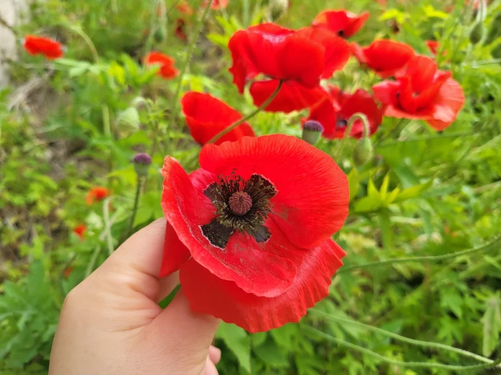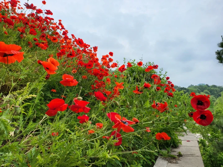 집 근처 호수를 산책하던 중 멀리서 빨간색 꽃 군락이 눈에 띕니다. 호수 산책로 5 메터 위쯤에 있는 도로가 옆인데 비탈진 블록을 밟고 올라가 사진을 담아봤습니다. 잎이 초록색인 것이 마약 성분이 있는 양귀비가 아니라 관상용 꽃 양귀비입니다.