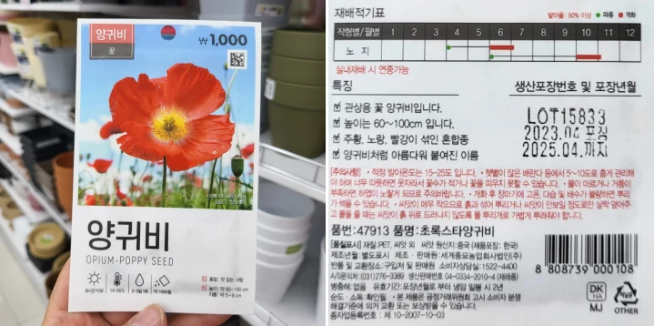 이런 관상용 양귀비 씨앗은 다이소 화훼코너에서도 쉽게 만나볼 수 있습니다. 양귀비는 60~100cm까지 성장하며 적정 발아온도는 15~25도입니다. 양귀비 꽃보다 더 예쁜 꽃들이 많이 있어 굳이 구입하지는 않았습니다.